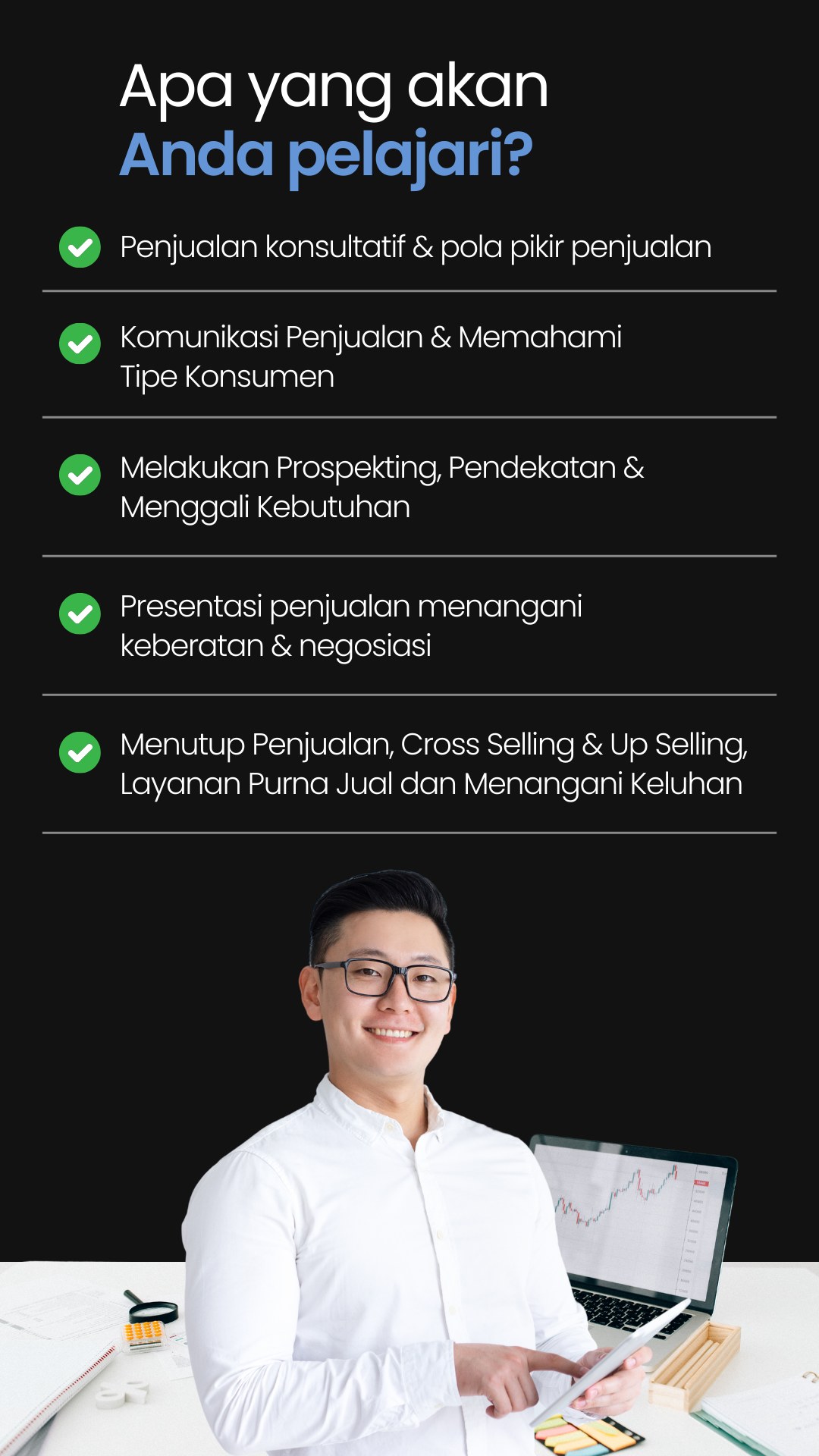 Kelas ini penting bagi Anda yang ingin sukses dalam penjualan! Pelajari komunikasi efektif, atasi keluhan dengan empati, dan bangun hubungan kuat dengan pelanggan.